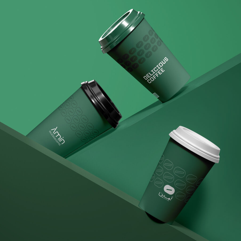 Packaging for Amin Café was designed with practicality and brand storytelling in mind. From paper cups and bottles to cookie packaging and various types of bags, each item was meticulously designed to reflect the brand’s modern simplicity. The consistent use of the green, black, and white color scheme, along with coffee bean-inspired patterns, ensured that the visual identity remained cohesive across all touchpoints.