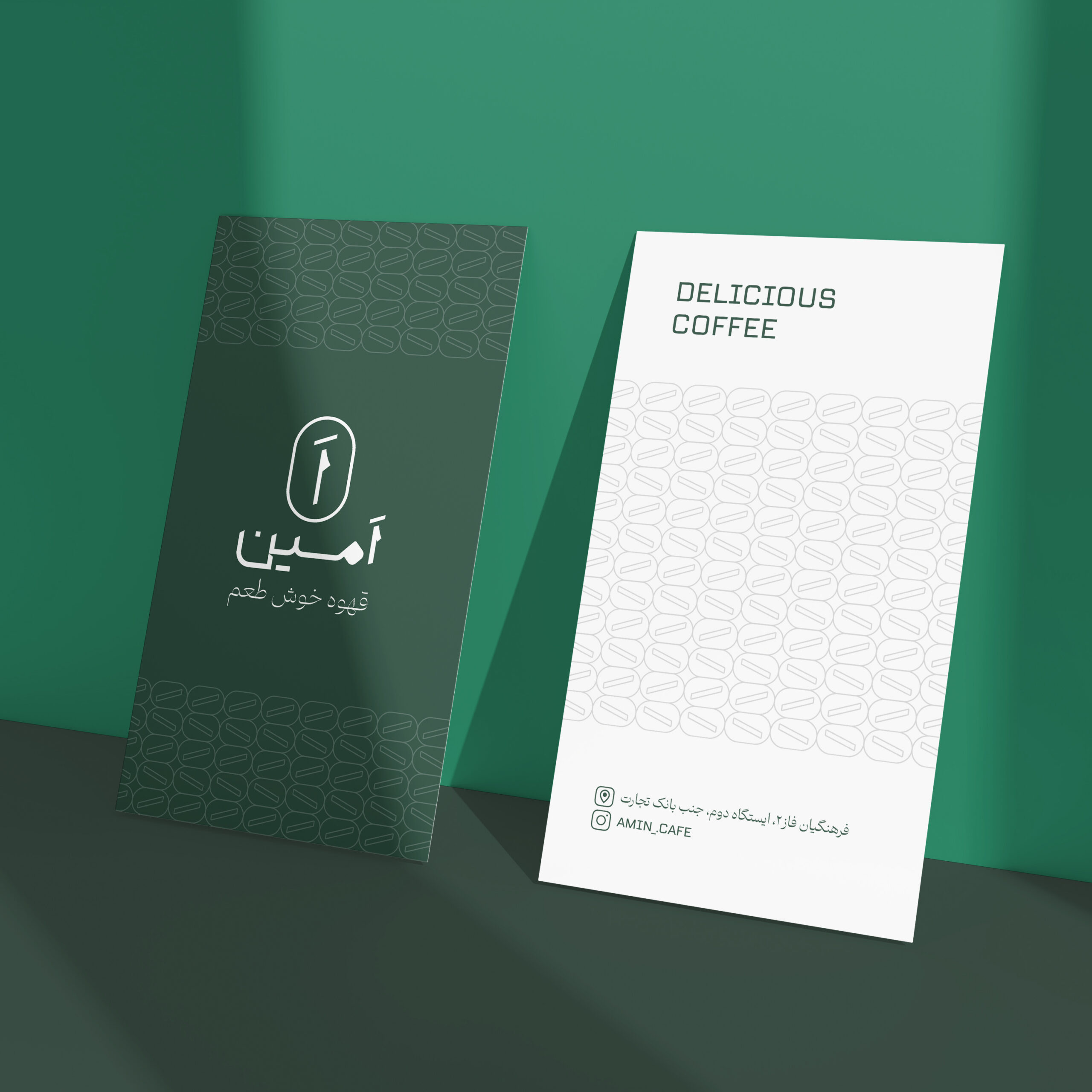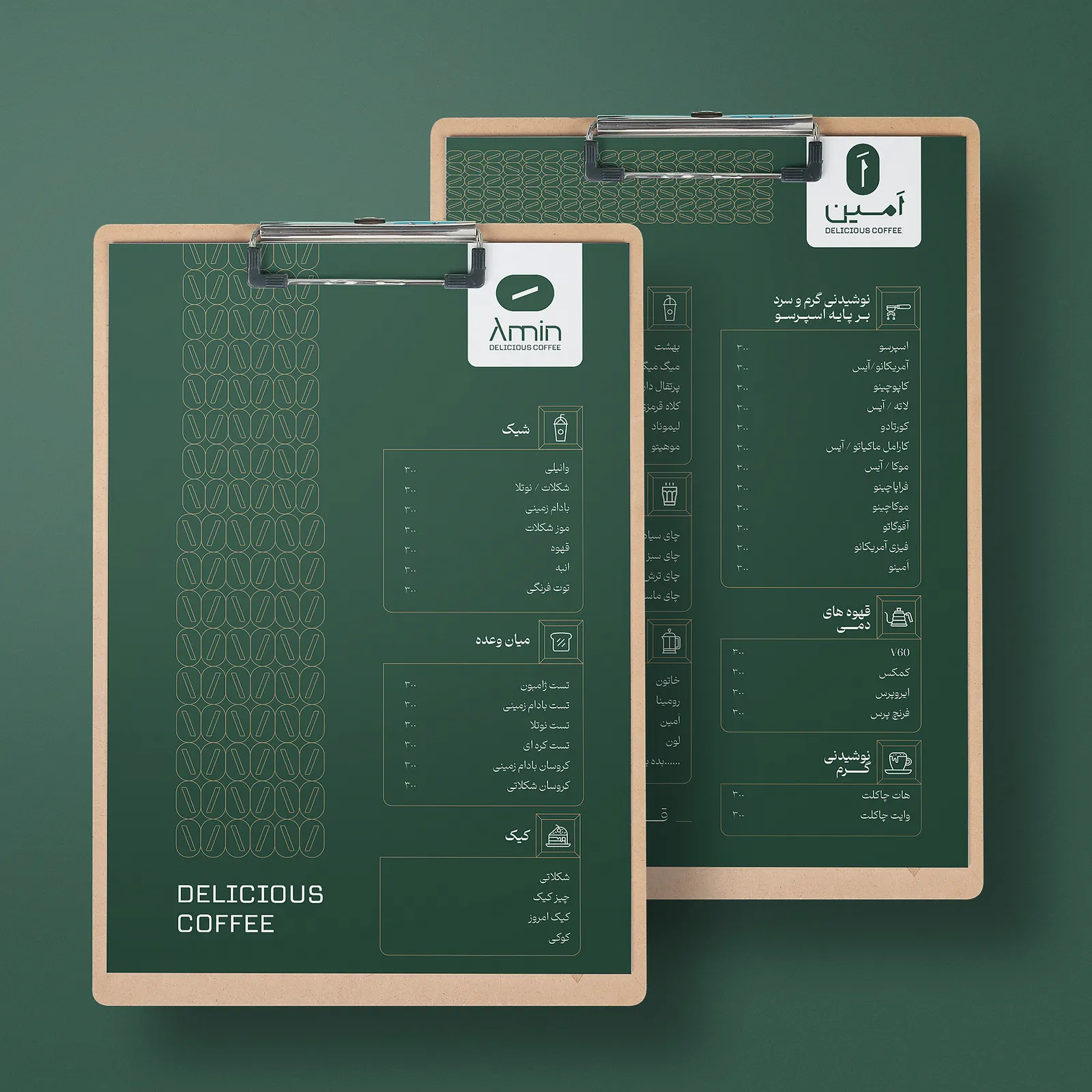 The logo design for Amin Café centers around its name “Amin,” combined with a symbolic coffee bean crack that subtly hints at its specialty. Two distinct typefaces were employed — TT Lake for its clean, modern structure and Dowran for a touch of sophistication — perfectly balancing simplicity with character.The color palette features a harmonious blend of green, black, and white, reflecting both freshness and timelessness. These colors were consistently applied across all brand elements, maintaining visual clarity and elegance.